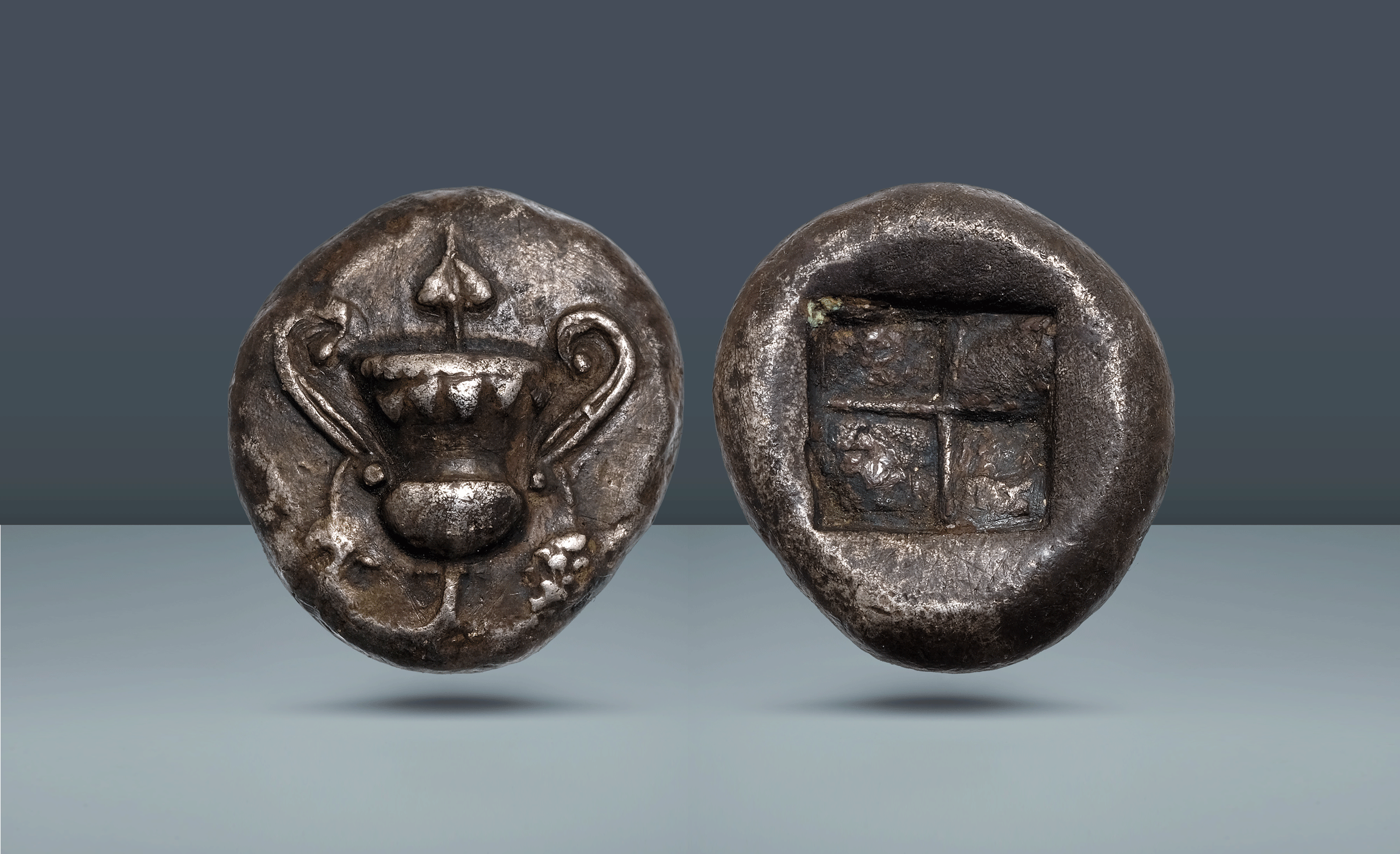 Kantharos with ivy wreath below lip and bunch of grapes hanging from each handle; above, ivy leaf / Quadripartite incuse square.